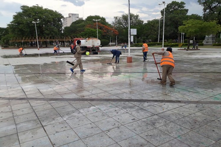 Una vez concluida la tradicional “Guerra de Pinturas”, protagonizada por los alumnos de diferentes centros educativos de la ciudad, celebrando el fin del año lectivo, las cuadrillas realizaron intensas tareas de limpieza para dejar en óptimas condiciones la zona central de la plaza San Martín