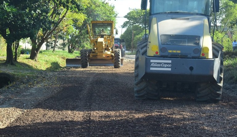 Agentes comunales, empleando maquinarias, prosiguen con las acciones de enripiado en el acceso al centro de salud del barrio.