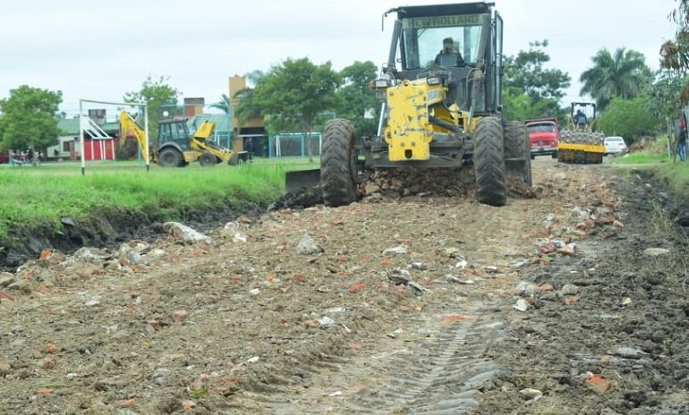 Con el empleo de máquinas, cuadrillas comunales intensificaron las acciones de distribución de escombros sobre la calle San Juan, entre Carlos Girola y Parkinson.